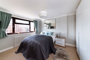 A large reception room and ideal home office which could be used as a family room or a ground floor bedroom. Fitted desk with drawers and fitted wall cabinets and base drawers and storage. Door to cloakroom.