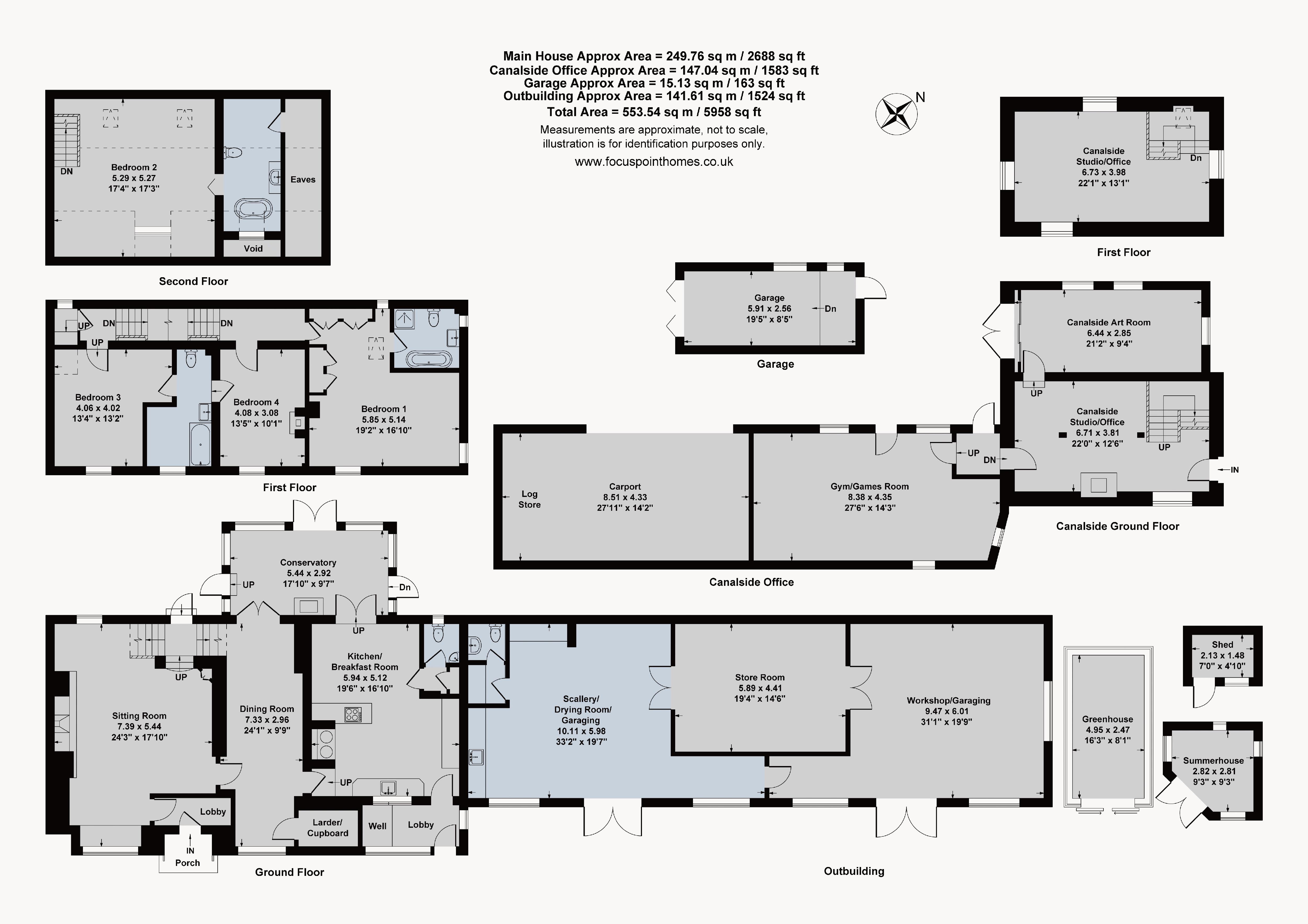 Outside, the property offers a great deal of additional space and potential. Attached to the house is a large workshop/barn/store measuring approximately 1,524 sq ft, comprising a cloakroom and utility area, a large store and a workshop, offering scope for integration into the main house or conversion to ancillary accommodation. Across the courtyard lies a substantial detached two-storey studio/office with a vaulted loft room overlooking the canal, with a studio art room and a separate games room/gym. Further outbuildings include a single garage, a large carport, a greenhouse and a tool shed.