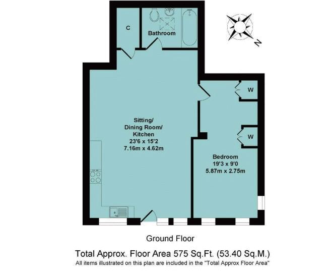 10 Meadow Drive, Middleton Cheney a very well-presented ground floor one-bedroom apartment, benefitting from its own private entrance and forming part of an attractive and well-maintained development with large, beautifully maintained communal gardens. The property offers light and well-planned open-plan living accommodation, with a spacious kitchen/living/dining area providing an ideal space for both everyday living and entertaining. The kitchen is fitted in a shaker style with light oak-effect work surfaces and includes a range of integrated appliances, including an oven, induction hob, dishwasher and fridge, together with ample space for a dining table. The living area is generous in size and includes a useful storage cupboard. The bedroom is a particularly good-sized double, featuring three windows which provide excellent natural light, along with a built-in wardrobe. The bathroom is fitted with a suite comprising a bath, WC and wash hand basin, marble effect panels and a skylight. Outside, the property benefits from an allocated parking space, together with additional visitor parking, along with access to the attractive communal gardens. A floorplan has been prepared to show the dimensions and layout of the property.